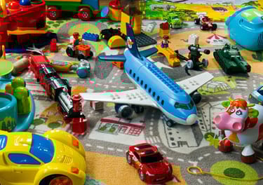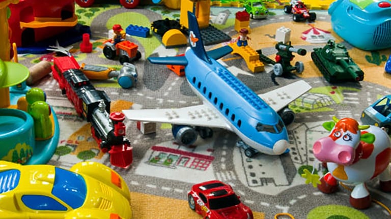 Peluches, pistas, bloques y más: todos esperando que alguien los lleve a casa y les dé vida con una buena historia.